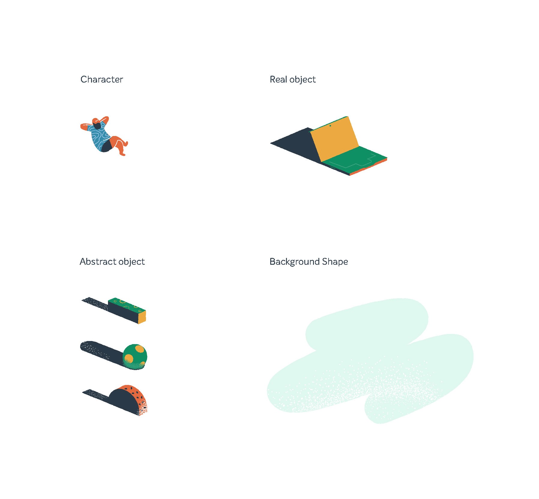 Characters, objects, and abstract elements designed to work together within a consistent visual logic